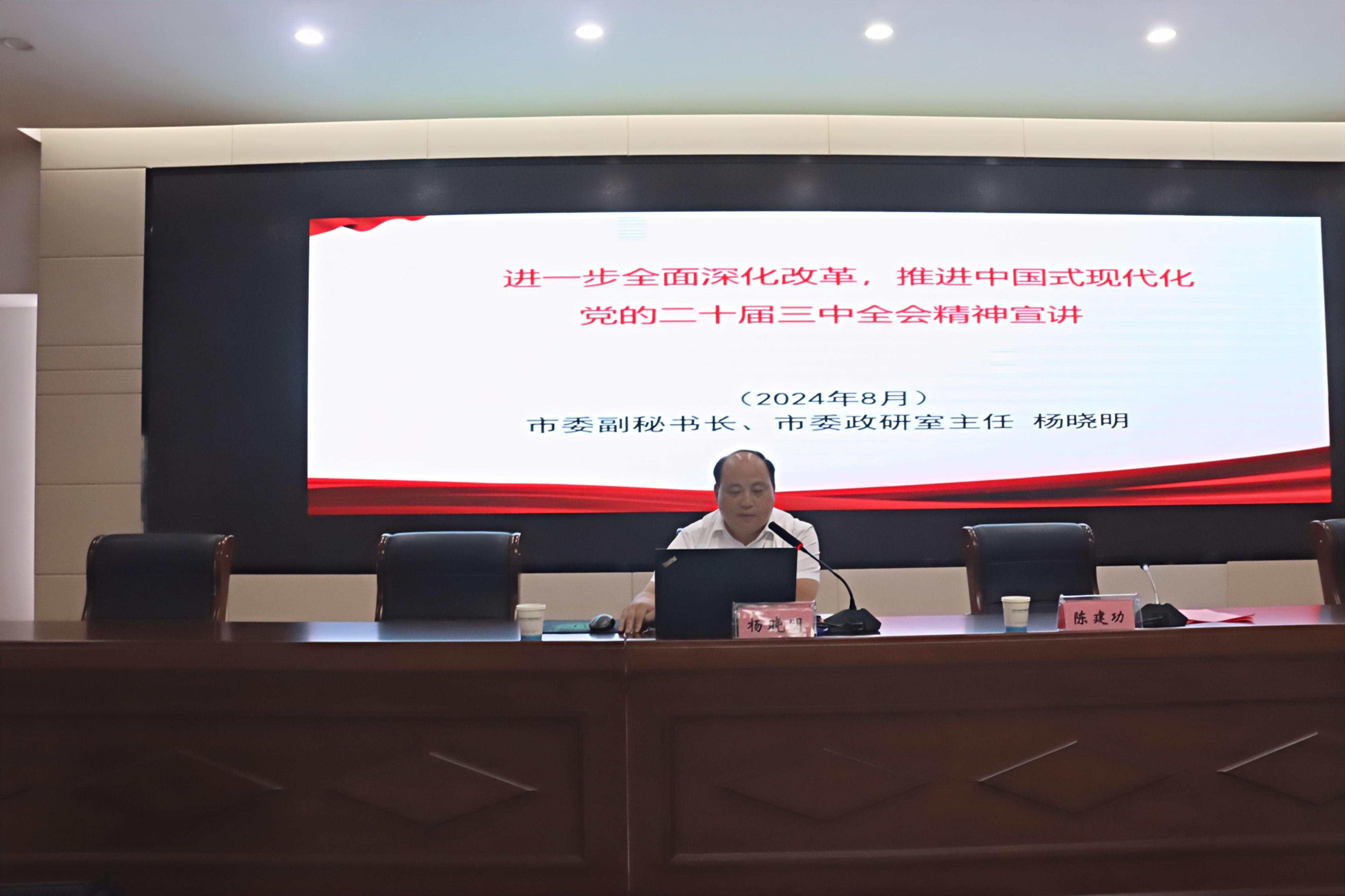 楊曉明以《進(jìn)一步全面深化改革推進(jìn)中國式現(xiàn)代化》為主題,緊緊圍繞習(xí)近平總書記在黨的二十屆三中全會上的重要講話和全會《決定》,從深刻認(rèn)識進(jìn)一步全面深化改革的重大意義、全面把握黨的二十屆三中全會的改革重點、以釘釘子精神抓好改革落實和從《決定》看國資國企高質(zhì)量發(fā)展方向四個方面,對全會精神進(jìn)行了系統(tǒng)闡述和全面講解,并結(jié)合蚌埠市工作實際,進(jìn)一步解讀了全面深化改革的主旨要義。