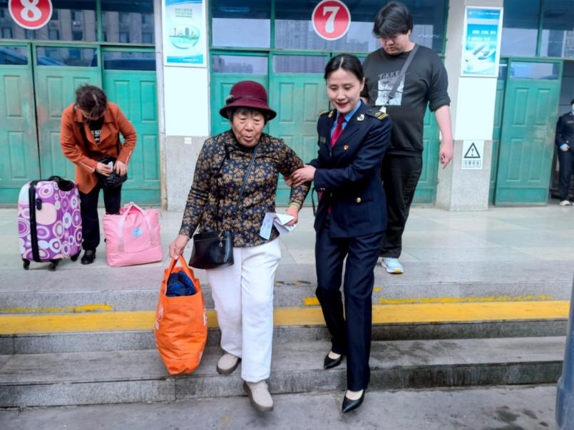 在熙攘的站區(qū),有一群始終在一線崗位上默默堅守的勞動者。在筆者按下相機快門的瞬間,一位站務員正攙扶著步履蹣跚的老人乘車,這名交通服務人員身姿挺拔,制服整潔,眼神專注且充滿關切,她的動作輕柔,傳遞著溫情與關懷,仿佛在告訴老人不必擔憂。行動不便的老人因為工作人員的陪伴而多了幾分安心,緩緩走出的每一步都像是在訴說著“有你,我放心”。